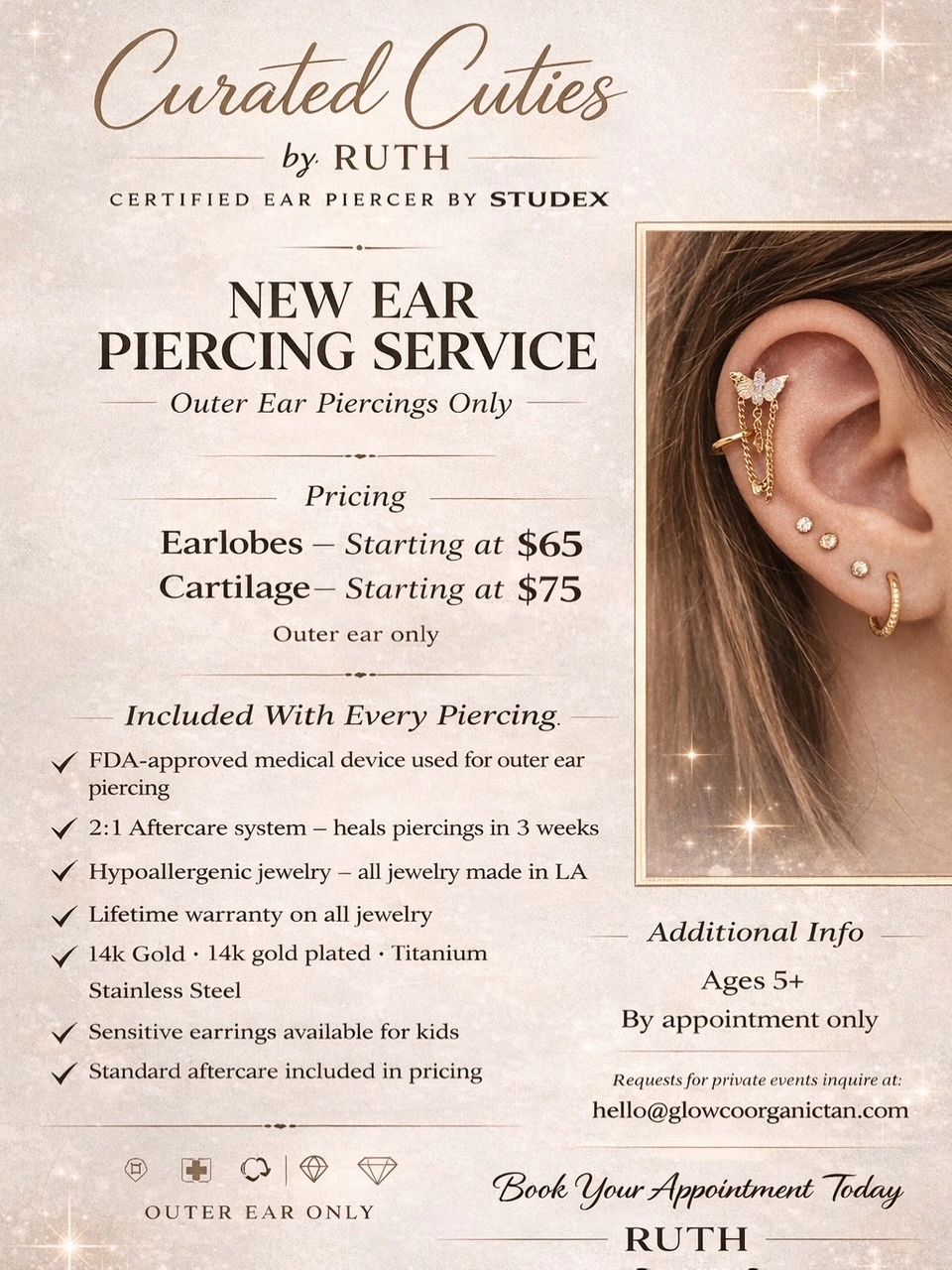 Proudly certified by Studex . We're committed to using only the highest quality, hypoallergenic jewelry made in the USA. Starting at just $65, our pricing includes essential aftercare to ensure your new look stays fabulous.